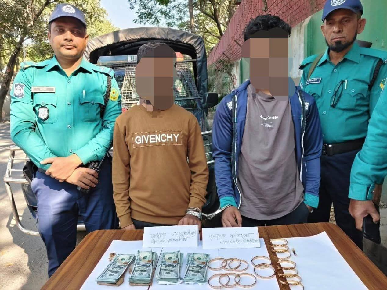 বিমানবন্দর সড়কে ২২ হাজার ডলার ও ৪৮০ গ্রাম স্বর্ণসহ দুই চোরাকারবারি আটক