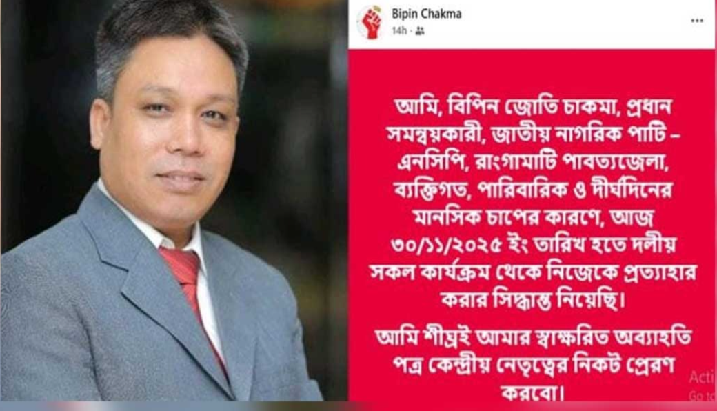 রাঙামাটিতে জাতীয় নাগরিক পার্টি (এনসিপি)’র প্রধান সমন্বয়কারী বিপিন জোতি চাকমা রাজনৈতিক কার্যক্রম থেকে সরে দাঁড়ানোর ঘোষণা দিয়েছেন। রবিবার (৩০ নভেম্বর)