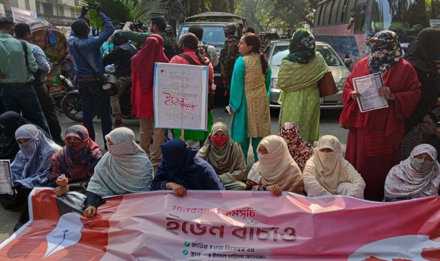 ইডেন মহিলা কলেজকে শুধুমাত্র নারীদের জন্য সংরক্ষিত রাখা এবং কোনো বিভাগ বন্ধ না করা—এমন পাঁচ দফা দাবিতে শিক্ষার্থীরা সড়ক অবরোধ